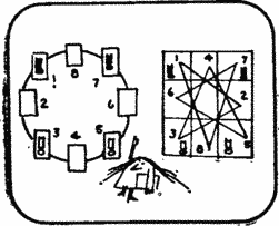 Звездчатый граф можно полностью «раскрыть» подобно графам в двух первых задачах о перестановке шахматных коней, его удается развернуть в окружность. После того как это сделано, семь монет нетрудно расположить на окружности и проанализировать, как они могут двигаться. Справиться с этой задачей можно многими способами. Одна из наиболее простых выигрышных стратегий состоит в том, чтобы делать любой ход первой монетой, а все следующие монеты ставить и передвигать всегда так, чтобы по окончании хода они заняли вершину, которую занимала в исходном положении предыдущая монета.