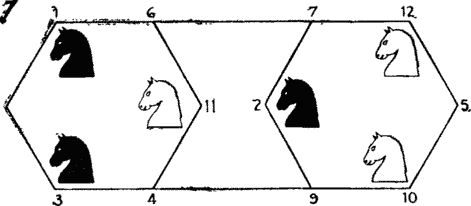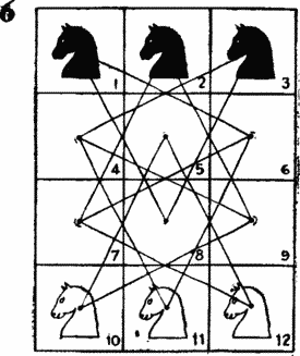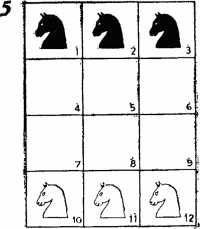 Вам понравилась задача о перестановке шахматных коней? Вот еще одна такая задача, по трудности даже превосходящая обе предыдущие. Рассмотрим позицию на шахматной доске 3?4, изображенную на рис. 5. Как и прежде, трех черных и трех белых коней требуется поменять местами так, чтобы белые кони оказались на верхней горизонтали, а черные заняли нижнюю горизонталь, причем выполнить перестановку за наименьшее число ходов.