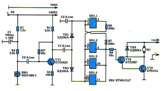 Акустическим датчиком служит электронный микрофон ВМ1, получающий питание от 9-вольтового источника через делитель R1, C1, R2. Появление звуковой команды вызывает всплеск тока микрофона, отчего на его выходе образуется импульс напряжения отрицательной полярности. Усиленный транзистором VT1, но уже с положительной полярностью, он поступает через диоды VD1, VD2 на входы логического узла, построенного на ячейках 2И-НЕ DD1.2 … DD1.4. В исходном состоянии ячейка DD1.1 заперта благодаря «заземленному» конденсатору С3 при входах 1, 2, а ячейки DD1.2 … DD1.4 открыты, имея на выходах 4, 10, 11 сигнал низкого уровня. Поэтому связанный с ними составной транзистор («силовой» коммутатор) VT2, VT3 заперт, и его нагрузка в виде двигателя M1 бездействует. Обратно включенный диод VD3 защищает транзисторы от перенапряжения при индуктивной нагрузке.