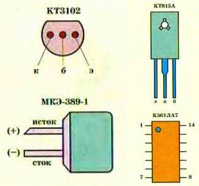Если понадобится управлять нагрузкой переменного тока, связанной с осветительной электросетью, используйте промежуточный коммутатор — электромагнитное реле типа РЭС-6 с низким напряжением срабатывания. Облегчит сборку устройства рисунок 2, показывающий расположение выводов, используемых в конструкции микрофона и полупроводниковых элементов.