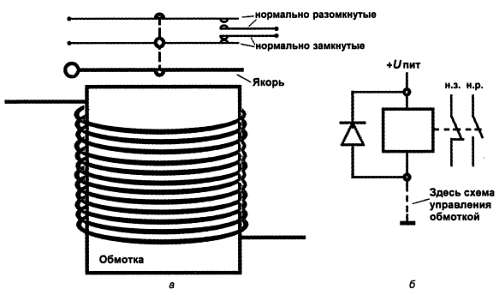 Рис. 7.1. Схематическое устройство (а) и рекомендуемая схема включения (б) электромагнитного реле