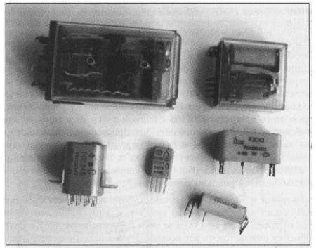 Также используется и вариант «перекидных» контактов, в которых присутствует центральный общий подпружиненный контакт, в нормальном положении замкнутый с одним из соседних, а при подаче тока перекидывающийся к другому. Если ток через обмотку снимается, то все возвращается в исходное состояние. Большинство типов реле содержит не одну, а несколько групп таких контактов, управляемых одним якорем. Это можно увидеть на рис. 7.2, где представлены некоторые типы реле.