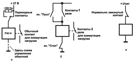 а — со снижением напряжения удержания; б — схема самоблокировки с кнопками «Пуск» и «Стоп», в — схема классического электромеханического звонка