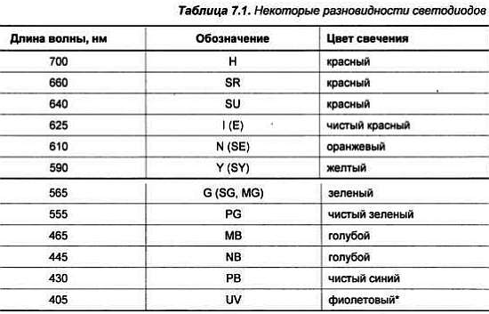 В настоящее время в целом проблемы решены, и освоен фактически весь видимый спектр, включая синий и даже ультрафиолетовый диапазоны. Характерной особенностью цветных светодиодов является то, что они излучают свет одной (точнее, близкой к этой одной) длины волны, из-за чего насыщенность излучаемого света превосходит все чаяния художников. Существуют не менее двух десятков разновидностей светодиодов для разных длин волн, охватывающих все цвета видимого спектра (частично они перечислены в табл. 7.1, обозначения соответствуют продукции фирмы Kingbright и некоторых других фирм). Часто можно встретить в продаже и светодиоды белого свечения (они получаются из цветных, если покрыть часть кристалла люминофором, преобразующим оттенки света), которые все больше используются в качестве экономичных и долговечных источников света.