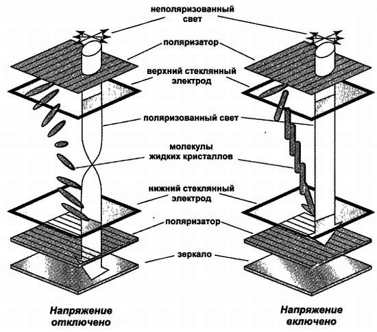 Здесь слой жидких кристаллов толщиной несколько микрон находится между двумя стеклянными электродами, причем, за счет специальной структуры поверхности стекла, молекулы кристалла ориентированы параллельно плоскости этих электродов. Сверху и снизу такого «сэндвича» расположены пластины-поляризаторы, ориентированные перпендикулярно друг другу. Толщина слоя жидких кристаллов рассчитана так, что в исходном состоянии он поворачивает плоскость поляризации световой волны ровно на 90°. В результате в обесточенной ячейке (рис. 7.8, слева) свет беспрепятственно проходит через весь «пирог», отражается от зеркала (оно сделано матовым, чтобы не отражало окружающих предметов) и возвращается обратно. Подобная матрица в обесточенном состоянии выглядит как обычная стеклянная пластинка.