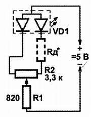 Двухцветный красно-зеленый светодиод VD1 трехвыводной, любого типа (автор использовал большой 10-миллиметровый L-819EGW фирмы Kingbright). Общим выводом он присоединен к источнику питания, двумя остальными — к крайним выводам потенциометра R2. Ползунок потенциометра соединяется с другим выводом источника питания через резистор R1, ограничивающий ток при нахождении ползунка в крайних положениях. Резистор Rд, показанный на схеме пунктиром, необязательный и служит для выравнивания яркостей, если одно из плечей (обычно — красное) горит сильнее другого, и изменение цвета при вращении ползунка происходит неравномерно. Номинал резистора R1 и переменного R2 должны находиться примерно в соотношении R1/R2 = 1/4-1/5. При этом яркость в крайних положениях ползунка максимальна, а к середине диапазона, когда светятся оба светодиода примерно одинаково, падает, но зрительно это почти незаметно, — меняется лишь оттенок свечения.