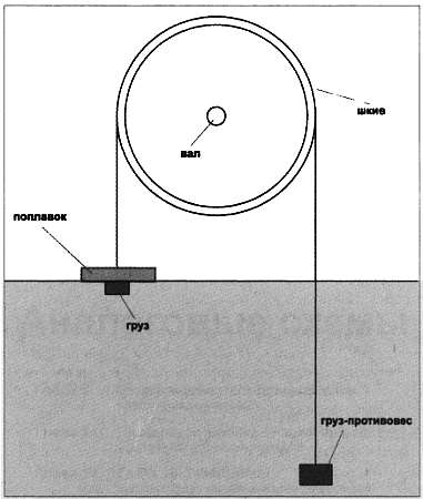 Ползунок переменного резистора жестко закреплен на одном валу с вращающимся шкивом, через который перекинута капроновая нитка с поплавком на одной стороне и грузом-противовесом на другой. Поплавок тоже подгружен дополнительным грузом так, чтобы сила натяжения нити на воздухе была достаточно большой, и нить не пыталась размотаться со шкива (вес этих грузов может составлять несколько сотен граммов). Поплавок делается из пенопласта, и разность между его весом в воздухе (вместе с весом груза) и весом груза-противовеса должна быть меньше плавучести поплавка (последняя по закону Архимеда равна в граммах объему вытесненной поплавком воды, выраженной в кубических сантиметрах). Грузы могут быть изготовлены из свинца, латуни, бронзы и даже алюминия — в общем, из любого материала, не подверженного воздействию воды. Угол поворота подвижной системы φ у разных типов переменных резисторов несколько различается, и обычно находится в пределах 240–260° (если не найдете данных по справочнику, придется измерить). Длина окружности шкива должна быть такой, чтобы обеспечить полный поворот ползунка на эту величину при движении поплавка от самого дна до поверхности. То есть диаметр шкива рассчитывается по формуле: (360/φ·Н)/π, где φ — максимальный угол поворота подвижной системы потенциометра, Н — максимальный перепад уровней. Диаметр шкива, измеренный по месту прилегания нити, должен быть подогнан под эту величину максимально точно. Нить несколько раз оборачивается вокруг шкива, чтобы она по нему не скользила.