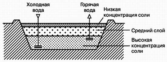 Солнечные пруды имеют высокую концентрацию соли в придонных слоях воды, неконвективный средний слой воды, в котором концентрация соли возрастает с глубиной и конвекционный слой с низкой концентрацией соли — на поверхности (http://www.energy-bio.ru/suncolll2.htm).