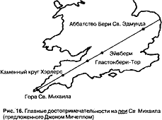 В книге «Вид на Атлантиду» Джон Мичелл приводит пример очень протяженного леи, ставшего с тех пор знаменитым, по крайней мере, среди охотников за леи и членов братства «Новый век». Мичелл полагает, что эта линия начинается с горы Святого Михаила близ Маразиона на полуострове Корнуолл, идет на восток, пересекает известный каменный круг Хэрлерс на Бодмин-Муре, проходит через несколько церквей, посвященных Св. Михаилу, до пика Гластонбери. Дальше она тянется на восток до Эйвбери-хендж и доходит до Св. Эдмунда аббатства Бери (рис. 16). Эта линия имеет протяженность около 500 километров (310 миль). Другие авторы — вроде Хэмиша Миллера, написавшего книгу «Солнце и змея» — предположили позже, что эта линия отмечает начальный энергетический меридиан планеты, охватывающий весь земной шар.