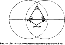 Не помню уже, что побудило меня подумать о равносторонних треугольниках. Быть может, то был треугольный рисунок леи между замком Гроувли, крепостью на холме Олд-Сэрам и Стоунхенджем, упомянутый в главе 1. Как бы то ни было, в один прекрасный весенний день 1976 года я нарисовал на своей карте равносторонний треугольник, поместив два его угла в центры двух кругов, а вершину — к северозападу от основания (рис. 18). Затем я соединил вершину с двумя точками, в которых соединяющая два центра прямая линия пересекает окружности двух кругов. Так получился новый треугольник, сразу же показавшийся мне знакомым. Я измерил его углы у основания с помощью транспортира и обнаружил, что они почти равны 52°.