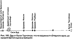 Покинув Комптон-Бассетт, окружность западного круга следует изгибу крутого откоса между возвышенностью и равниной на протяжении свыше 7,24 километра (4,5 мили) через Хаиуэи-Хилл, Кливенси-Хилл и Клифф-Хэнгинг. Выезжайте из Комптон-Бассетта и следуйте по дороге вдоль основания откоса до указателя «Кливенси», где и поверните направо. Следующий объект — Бугор Таунсенда находится в конце узкой улочки по левой стороне. Это древний конический могильный холм, возможно включающий захоронение, и он вполне мог служить точкой съемки с помощью реперных знаков, описанных в главе 11. Это предположение подкрепляется тем, что бугор служит окончанием построения по прямой линии — аббатство Брейденстоук — церковь Родборн с ее древним крестом — церковь Корстон — церковь фоксли-Грин — церковь Лейхертон — продолговатый курган Боксуэлл. Всего здесь насчитывается семь объектов на расстоянии в 28 километров (16,53 мили) (рис. 102).