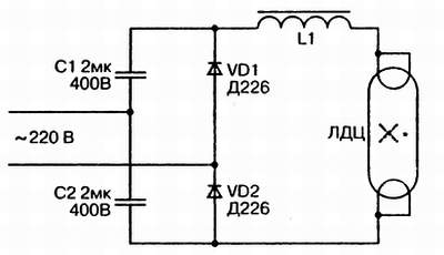 При подаче питания, пока лампа не горит в течение одной половины периода сетевого напряжения, через диод VD2 заряжается до амплитудного значения конденсатор С2, в течение следующей половины периода сетевого напряжения через диод VD1 заряжается до амплитудного значения конденсатор С1. В результате к лампе прикладывается постоянное напряжение, равное удвоенному амплитудному значению напряжения сети. Лампа зажигается, и штатный дроссель ограничивает ток.