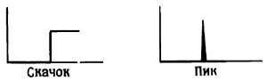 Сигналы в виде скачков и пиков. Сигналы в виде скачков и пиков упоминаются часто, но широкого применения не находят. К их помощи прибегают для описания работы схем. Если попытаться их нарисовать, то они будут выглядеть так, как показано на рис. 1.26. Скачок представляет собой часть прямоугольного сигнала, а пик — это два скачка, следующие с очень коротким интервалом.