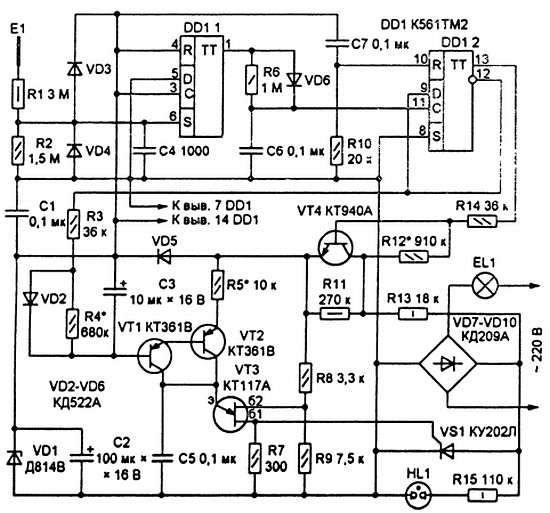 При включении питания пусковая цепочка, состоящая из элементов R10, С7 устанавливает триггер DD1.2 в состояние, при котором на выходе 13 образуется уровень лог. 0, а на выходе 12 — лог. 1. Конденсатор С3 пока разряжен, составной транзистор VT1, VT2 закрыт, и генератор импульсов, собранный на однопереходном транзисторе VT3, не работает. Поэтому тиристор VS1 закрыт, горизонтальная по схеме диагональ выпрямительного моста VD7-VD10 разомкнута, осветительная лампа EL1 погашена и горит неоновая лампа HL1, сигнализируя о наличии напряжения в сети, исправности лампы EL1 и облегчая поиск выключателя в темном помещении. Напряжение сети, выпрямленное диодным мостом, подается через резисторы R13, R11 и диод VD5 на стабилитрон VD1. Стабилизированное им напряжение служит для питания микросхемы DD1, конденсатор С2 — сглаживающий. Сопротивления резисторов R12 и R14 выбраны так, чтобы транзистор VT4 был заперт (потенциал базы ниже потенциала эмиттера). Таким является состояние схемы в режиме «Выключено». Ток, потребляемый устройством в этом режиме, немногим более 1 мА.