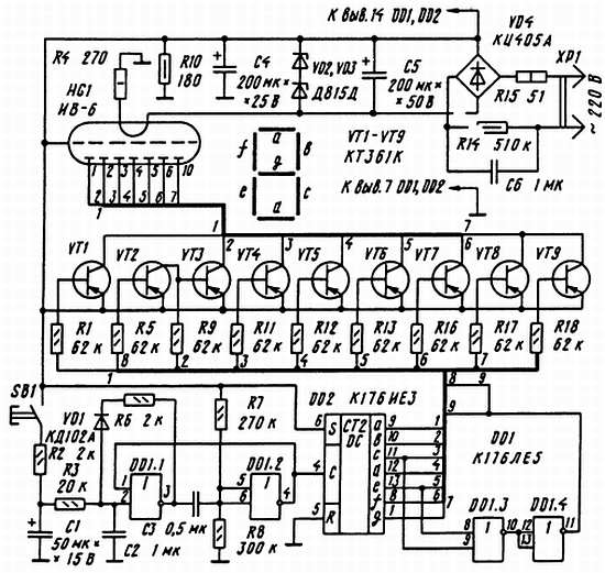 В качестве HG1 в устройстве использован вакуумный катодолюминесцентный одноразрядный индикатор ИВ-6. Кроме пронумерованных на схеме выводов анодов-сегментов, выводы катода — 7 и 8, вывод сетки — 9. Сигналы с выходов дешифратора подаются на аноды-сегменты через ключи-инверторы на транзисторах VT1-VT9.