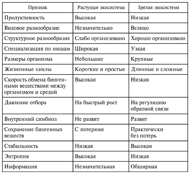 5. Каковы сравнительные характеристики развивающейся и зрелой экосистем?