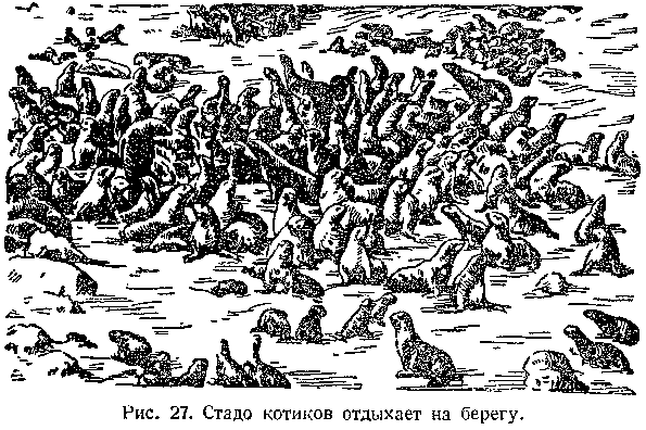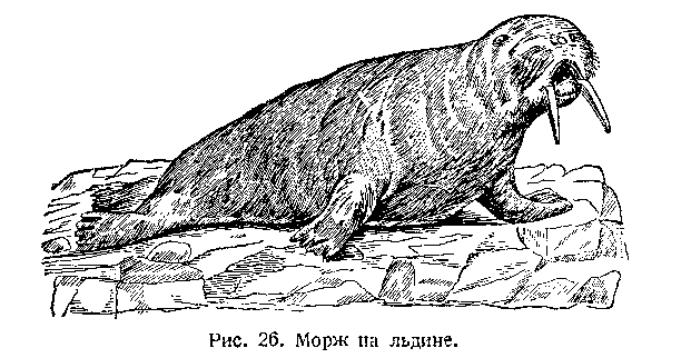 В море приспособились жить и некоторые млекопитающие. То высунет из воды свою круглую голову тюлень или клыкастый морж, то покажется гладкая блестящая спина дельфина, то раздастся посапывание и появится фонтан водяных паров над поднявшимся к поверхности китом. Всем этим крупным зверям приходится время от времени появляться из глубины моря, чтобы набрать в свои лёгкие воздух. Как и их наземные прародители, они имеют горячую кровь, выкармливают детёнышей молоком. Многие, как тюлени и моржи, сохранили ещё ноги, при помощи которых они довольно неуклюже ползают по льду или по земле. Они щенятся на прибрежных отмелях или пловучих льдах и долго выкармливают своих детёнышей молоком. Чтобы защитить беспомощного новорожденного, тюлени щенятся на далёких пловучих льдах или уединённых островах. У породы тюленя, щенящегося среди льдов, детёныши рождаются с пушистым белым мехом. Это маскирует их на льдине. На острова выходят размножаться морские котики — большие тюлени с драгоценным мягким мехом. Большую часть времени года они проводят в открытом море, питаясь рыбой и другими морскими животными.