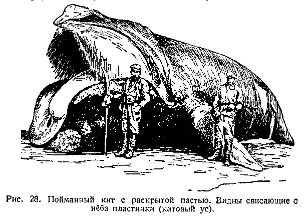 Дельфины и киты настолько приспособились к жизни в море, что потеряли даже внешние признаки наземного животного. Тело их приняло своеобразную рыбью форму. Кожа стала гладкой, мех исчез. Недаром во многих народных сказках говорится — "рыба-кит". Вместо ног имеется только одна передняя пара конечностей и она превратилась в плавники. На конце тела образовался настоящий рыбий хвост. Он только поставлен горизонтально, а не вертикально, как у рыб. Всё это способствует быстрому плаванию. Дельфины легко догоняют пароходы. Они — зубастые хищники, конкуренты акул. Зато кит — мирное животное. Киты, как и гигантские акулы, о которых говорилось выше, питаются всякой мелочью, в громадном количестве населяющей морские воды. Основной пищей китов служат рачки, черви, косяки мелкой рыбы и сельдей. Для того, чтобы извлечь из воды эту мелкую добычу, у китов совершенно изменился рот. Пасть кита превратилась в цедильный аппарат. Вместо зубов с нёба свешиваются сотни роговых пластинок (китовый ус), сквозь которые кит цедит воду. Вся мелкая живность оседает во рту, затем он языком слизывает улов.