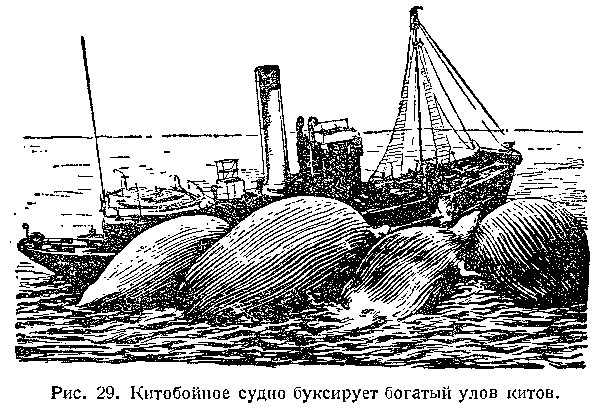 Целые китобойные флотилии выходят на кита в море. Во главе идёт корабль-матка. Вокруг шныряют небольшие быстроходные пароходики, вооружённые гарпунными пушками. Корабль-матка — это пловучий завод, на котором туша кита подвергается полной обработке. Вот показалась спина двадцатиметрового кита. Выстрел из гарпунной пушки — и убитый кит на толстом канате буксируется к судну-матке для разделки, вытопки сала, использования мяса и костей. Можно 6 товарных вагонов нагрузить большой тушей кита.