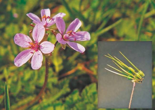 Длинные усики Аистника цикутного выполняют двойную задачу: они играют роль двигателей при выбрасывании семян весной и служат буром при посеве их в землю.