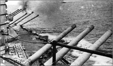Линейный корабль «Парижская Коммуна» ведет огонь по противнику, 1942 г.