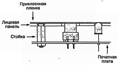 Печатная плата с индикаторами и сенсорными кнопками должна располагаться непосредственно за лицевой панелью. Для ее крепления используются винты с потайными головками, утопленными в панель под пленкой с рисунком. Монтаж компонентов следует выполнять после временного прикрепления печатной платы к лицевой панели и тщательной разметки необходимых отверстий. Размеры отверстий в местах установки кнопок должны выбираться с запасом. Желательно не поднимать компоненты над платой и располагать ее так, чтобы расстояние до лицевой панели определялось высотой кнопки.