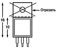 При сборке портативного устройства, размещаемого в каркасе небольшой толщины, нередко возникает проблема монтажа полупроводникового прибора, имеющего значительную высоту корпуса, когда из-за нехватки места его невозможно разместить в горизонтальном положении. Это относится, например, к транзисторам в корпусе ТО220, которые встречаются чаще, чем приборы в небольшом корпусе (ТО92). В то же время в малогабаритных устройствах с питанием от батарейки рассеиваемая мощность обычно невелика. В таком случае вполне допустимо аккуратно отпилить верхнюю часть корпуса с отверстием (рис. 3.22) или удалить ее с помощью кусачек.