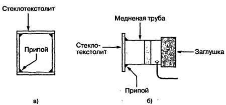 Для небольшой сборки корпус можно изготовить из отрезка медной трубы, которая с одного конца запаивается обрезком фольгированного стеклотекстолита, а с другой закрывается заглушкой (рис. 3.18б).