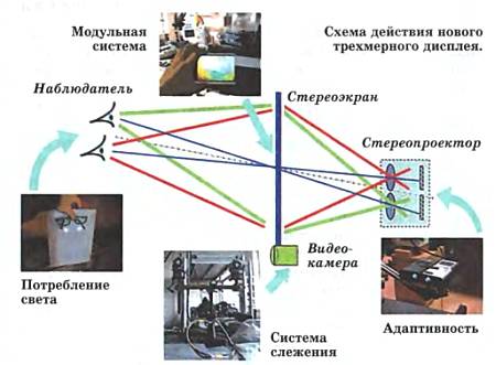 Для решения этих проблем и создана схема адаптивного дисплея, который показывает многоракурсную стереоинформацию, причем каждому зрителю индивидуально.
