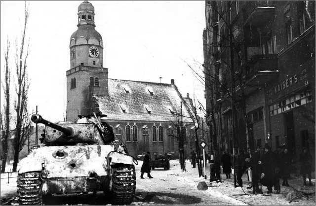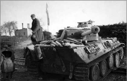 «Пантера» Ausf.G, подбитая на улицах Познани в январе 1945 года. Обращают на себя внимание две сквозные пробоины в лобовой броне корпуса.
