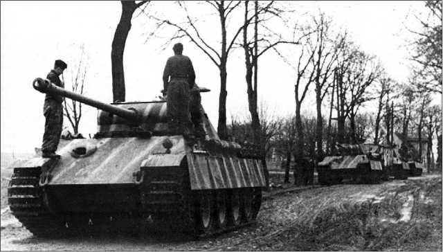 Колонна «пантер» танковой дивизии «Мюнхеберг» выдвигается к линии фронта. Район Кюстринского плацдарма, март 1945 года.