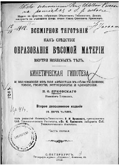 Мы не будем здесь детально обсуждать теорию гравитации Ярковского. Скажем только, что она относится к тем механистическим моделям тяготения, которые были порождены в XIX в. успехами кинетической теории газов. На определенном этапе эти модели были весьма популярны, в их разработке принимали участие корифеи теоретической физики – Максвелл, Пуанкаре и др. Упорные попытки создать на смену феноменологической модели Ньютона более наглядную «физическую» модель гравитации продолжались еще в начале XX в. Например, крупнейший нидерландский физик Хендрик Лоренц (1853–1928) в статье «Размышления о тяготении» (1900 г.) рассматривал практически тот же механизм экранирования, что и Ярковский, но как источник давления предполагал не частицы эфира, а цуги электромагнитных волн, равномерно заполняющих пространство. Но в конце концов история физики зафиксировала это направление как тупиковое, и профессиональные физики более к нему не обращались.