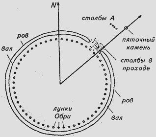 "Хенджами" в Британии называют доисторические объекты, представляющие собой круговые рвы и валы, часто с употреблением стоячих камней. Существенно, что подобных сооружений известно более 1000. Хенджи делят на два типа: у первого типа (тип I) имеется только один проход в земляных сооружениях; тогда как у хенджей второго типа два входа – один против другого. Обычно вал насыпается с внешней стороны рва. По этому определению хенджем был только самый древний Стоунхендж-I. Но и он имел интересную и важнейшую для дальнейшей судьбы памятника особенность – два вала: один (большой) с внутренней стороны рва и другой (малый) с внешней стороны. Внутри обвалованной площадки, как считают археологи, были только "лунки Обри". К этому же периоду относят столбы в проходе, столбы "А" и "Пяточный камень" (рис. 72). Единственное убедительное толкование имеют только столбы в проходе и столбы А – х называют остатками ближних визиров обсерватории одного события – восхода Луны. Это основная археоастрономическая деталь Стоунхенджа. Впрочем, обсерваторная ценность лунных событий более чем проблематична, да и дальних визиров на этих азимутах нет. Все другие археоастрономические реконструкции демонстрируют только потенциальную возможность конструкции. Без дальних визиров (от которых не осталось никаких следов) градусные точности на ближних визирах не имеют технологического (обсерваторного) смысла. Обсерватория не может быть надежно доказана, как не может быть и отвергнута. Вопрос об обсерватории Стоунхенджа не имеет однозначного ответа.