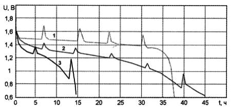 Отметим, что большинство литиевых элементов имеет номинальное напряжение 3 В (для них значение напряжения на графике следует умножить на два), но в последние годы появились и элементы этого типа, аналогичные обычным щелочным. Как видите, зависит напряжение не только от времени — отдельные пики на графиках относятся к моментам, когда нагрузка отключалась, при этом напряжение элемента скачкообразно росло, а затем, при ее подключении, снова падало.