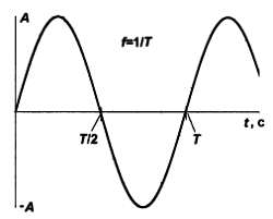 Отрезок времени Т есть период изменения, а величина А носит название амплитуды и представляет собой максимальное значение нашей переменной в одном периоде (отметим, что для синусоидального закона минимальное значение — на части графика ниже оси абсцисс — строго равно максимальному). Величина, обратная периоду, обозначается буквой f и носит название частоты (см. формулу на рис. 4.2 вверху). Для нее придумана специальная единица измерения — это хорошо всём знакомый герц (Гц), названный так в честь немецкого физика XIX века Генриха Герца, доказавшего существование радиоволн.