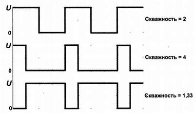 Для прямоугольных напряжений, представляющих собой меандр, подобный рис. 4.5, б, существует еще одна важная характеристика. Никто ведь не запрещает представить себе прямоугольное напряжение, в котором впадины короче или длиннее всплесков. В электронике меандр без дополнительных пояснений означает симметричную форму прямоугольного напряжения, при которой впадины строго равны всплескам по длительности, но, вообще говоря, это необязательно. На рис. 4.6 приведены два примера таких напряжений в сравнении с симметричным меандром. Характеристика соотношений между длительностями частей периода называется скважностью и определяется, как отношение длительности всего периода к длительности положительной части (именно так, а не наоборот, т. е. величина скважности всегда больше 1). Для меандра скважность равна 2, для узких коротких импульсов она будет больше 2, для широких — меньше.