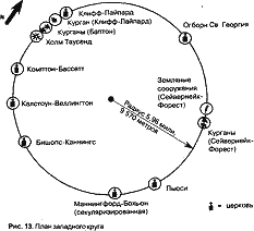 Начала прорисовываться схема, еще убедительнее показывающая продуманность размещения этих двух сцепленных кругов. Однако их взаимное расположение стало для меня новой головоломкой.