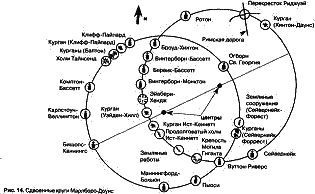 На этот раз я проделал тот же математический анализ, что и в случае первого круга. Второй круг дал средний радиус в 9570 метров (31 390 футов) — менее, чем на семь метров короче 9576,78 метра, числа, вычисленного мною как 1/666 часть радиуса Земли на экваторе. Вдобавок я обнаружил, что церковь в Бишопс-Каннингс расположена на одной линии с центрами обоих кругов (рис. 14).