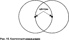 Двойные круги широко использовались в качестве основополагающей композиции в искусстве и архитектуре средневековья, но обычно они подчинялись традиционному рисунку, известному под названием «весика писцес» («рыбий пузырь»). Этот простенький рисунок, лежащий в основе почти всей «священной геометрии», составляется из двух кругов одинакового диаметра таким образом, чтобы центр одного круга лежал на окружности другого (рис. 15).