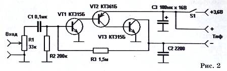 Ток выходного транзистора VT3 определен сопротивлением телефонов: например, при токе 1 мА падение напряжения на телефонах составит 4,4 В, тогда усилитель надо питать от 9-вольтовой батареи. Все транзисторы охвачены единой цепью отрицательной обратной связи (ООС) через резистор R3, она стабилизирует их режим по постоянному току. Стабилизация осуществляется так: пусть по каким-то причинам коллекторное напряжение VT3 возросло, тогда увеличившийся ток через резистор R3 сильнее открывает транзистор VT1, и напряжение на его коллекторе падает, закрывая транзистор VT2. Его коллекторное напряжение возрастает, открывая транзистор VT3, его ток и падение напряжения на телефонах увеличиваются, и режим приходит в норму.