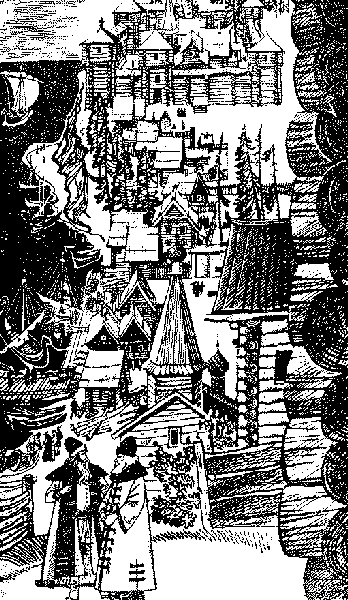 ...Заря догорела. Из-за широкого плеса ветер донес запах костра. Направо, над откосом, в порывах сиверка трепетало на шесте диковинное полотнище, похожее на хоругвь из иллюстраций к древнерусским сказаниям. Еще минута — и лодка причалила к берегу Мангазеи...