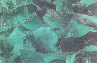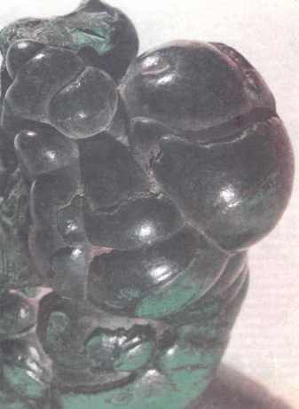 Малахитовые «рубашечки» медных руд издавна служат прекрасным поисковым признаком меди. И не только отдельные вкрапленники красит в зелень малахит — вся сопка над медной рудой ясно зеленеет. Видишь такую зелень — ищи на глубине медную руду. На Урале же нагляделись издавна на «крашеные» скалы и приспособились красить таким вот порошковым малахитом и крыши, дескать, раз краска эта «от сырости» по медной руде пошла, значит, сама уж она ни сырости, ни дождя не побоится! Ну, а рисунчатый малахит как исстари, так и по сей день остается одним из самых великолепных поделочных камней.