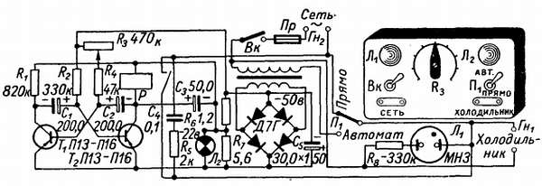 Собирается прибор в пластмассовом или металлическом корпусе. На передней панели монтируются гнезда Гн1 для подключения холодильника и Гн2 для подключения самого прибора к сети переменного тока, гнездо предохранителя Пр, тумблеры П1 и Вк, индикаторные лампы и регулируемый резистор R3. Около ручки этого резистора устанавливается шкала, градуированная в секундах (от 20 до 60 сек). Около переключателя (тумблера П1) устанавливаются надписи «прямо» и «автомат».
