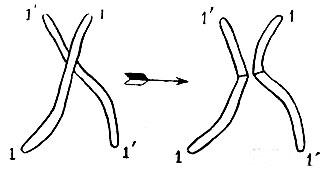 Рис.6. Кроссинговер. Слева - две гомологичные хромосомы в контакте; справа - после обмена и разделения.