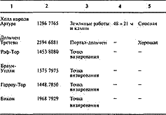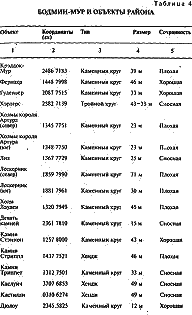 Я также включил в исследование дольмен Третеви и земляные сооружения у Холла Артура, где более 50 камней расположены в форме прямоугольника на валу. Считается, что он использовался для обрядовых целей, и почти не вызывает сомнений его одновременное сооружение с кругами и хенджами этого района. В таблице 4 даются необходимые детали всех включенных объектов.