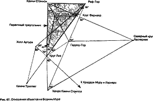Так было найдено первое ясное доказательство связи с храмовыми объектами Бредон-Хилла. Точные углы в 35º и 55° между двумя кругами и Тором вряд ли получились случайно. Дело в том, что этот треугольник оказался первичным для всего района. Из него могут быть выведены все остальные круговые объекты. На рисунке 67 показано, как это делается.