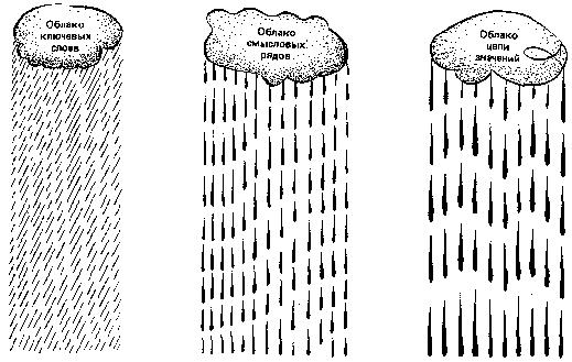 При разработке дифференциального алгоритма мы не предполагали, что может быть дано его зрительное описание. Однако слушатели курсов предложили оригинальное решение зрительного образа алгоритма, что, несомненно, способствует лучшему его пониманию и облегчает его практическое освоение. На рис. 14 алгоритм показан в виде системы облаков. Первые облачка — ключевые слова — разряжаются мелким дождем. Затем они сливаются и образуют облака смысловых рядов, что выражено в крупных каплях, и, наконец, третий образ — туча, которая вмещает в себя все предыдущие облака. Туча значения проливается еще более крупными каплями, а возможно, и градом. Концентрируется смысловая энергия — доминанта текста. На рис. 15 показан еще одни пример зрительного представления алгоритма, который не требует пояснения. Мы рекомендуем вам придумать и изготовить подобные рисунки самостоятельно.