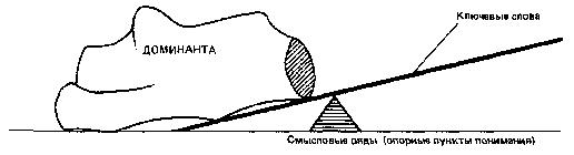 Доминанта — главная смысловая часть текста. Она выражается своими словами, на языке собственных мыслей, является результатом переработки текста, его осмысления в соответствии с индивидуальными особенностями читателя, выявления основного замысла автора. Таким образом, в тексте встречаются слова, которые как бы «подталкивают» вас читать дальше, дальше, предупреждают, что изменений смысла не предвидится. Бывают другие слова, которые «предупреждают» об изменении, «повороте» смысла, «говорят» вам, чтобы вы замедлили скорость чтения, что впереди «крутой поворот». Очень важно знать, как пользоваться такими словами-сигналами.