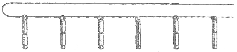 Он похож на электрическую лампочку — такой же тонкий волосок. Только тут волосок не запаян в пустую стеклянную колбу, а укутан специальной взрывчатой ватой. Если пустить в запал ток, волосок раскалится, вспыхнет вата, взорвется капсюль, «зачинщик», а с ним и шашка. Несколько запалов соединяют вместе проводами, точно елочные гирлянды электрических лампочек. Можно их так хоть сотню вместе соединить.