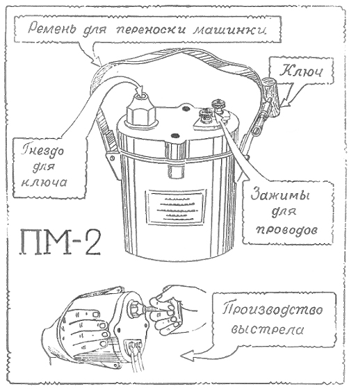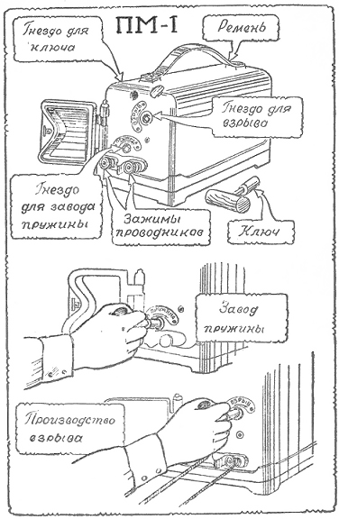 Гораздо удобнее батарей специальная подрывная машинка. Она похожа на игрушечную электростанцию. Там стоит электрическая машина, такая же, как на настоящей электростанции, только очень маленькая. И вертит ее не турбина, а пружинный завод. Его заводят ключом, как моторы игрушечных автомобилей.